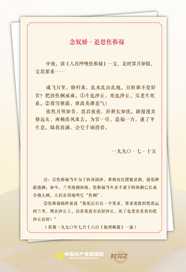 “中夜,读《人民呼唤焦裕禄》一文,是时霁月如银,文思萦系……”1990715日,时任福州市委书记的习近平写下《念奴娇·追思焦裕禄》。
