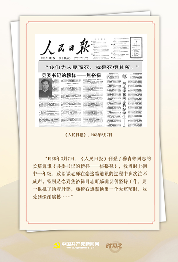 196627日,《人民日报》头版位置刊登了新华社记者的长篇通讯《县委书记的榜样——焦裕禄》。谈起这段往事,习近平曾说:“我当时上初中一年级,政治课老师在念这篇通讯的过程中多次泣不成声。特别是念到焦裕禄同志肝癌晚期仍坚持工作,用一根棍子顶着肝部,藤椅右边被顶出一个大窟窿时,我受到深深震撼……”。